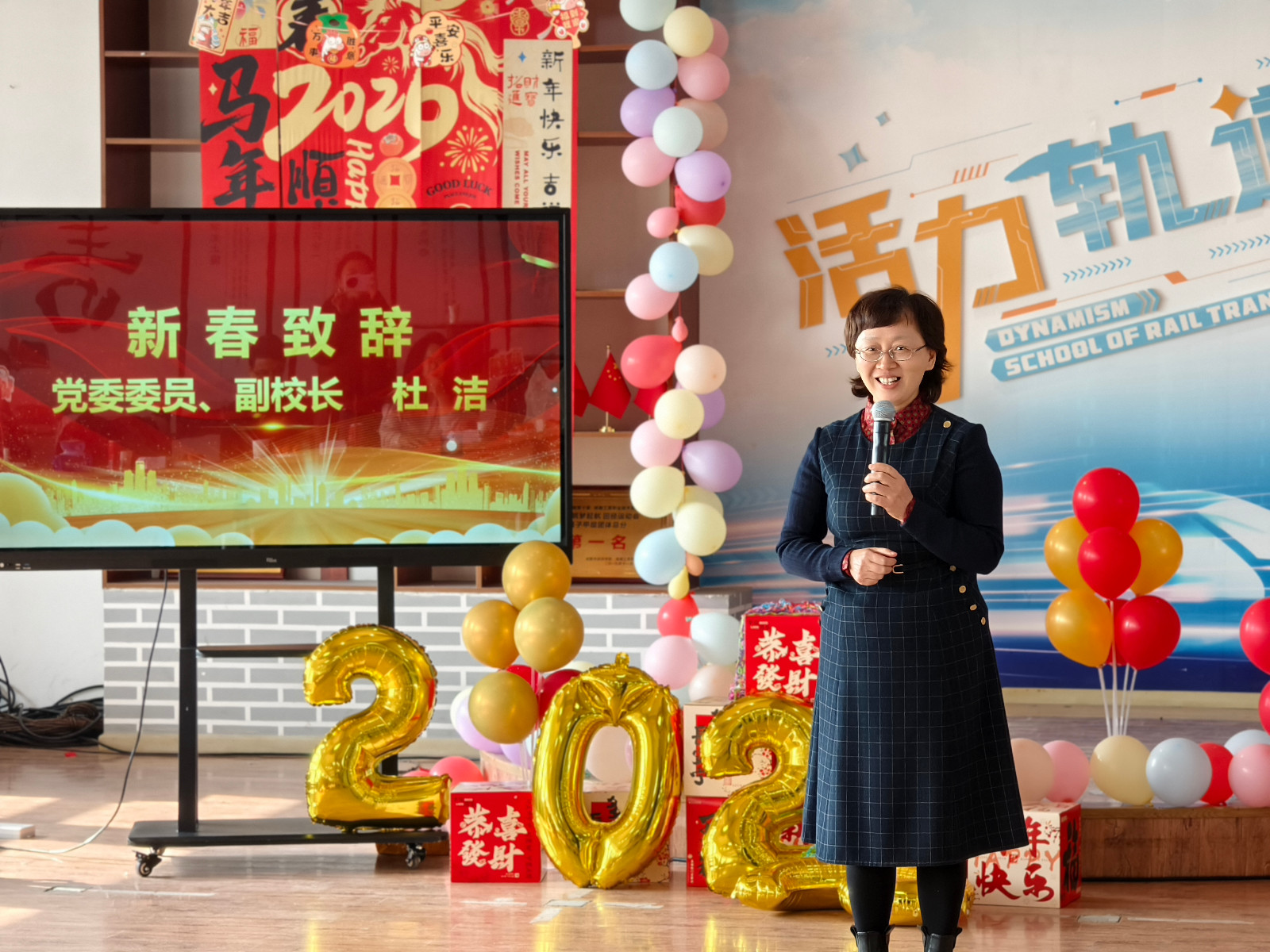 总结过去,是为了更好地迈向未来。会上,轨道交通学院副院长杨丽均首先作教学工作总结,系统梳理了过去一年在教育教学、专业建设等方面取得的扎实成效。党总支副书记蒋晶晶随后讲话,充分肯定了全体教师在立德树人、学生工作等方面的辛勤付出。成都工贸职业技术学院党委委员、党委宣传统战部部长、轨道交通学院院长徐健在讲话中,从学院发展全局出发,分析了当前形势,展望了未来方向,激励大家再接再厉。学校党委委员、副校长杜洁女士莅临现场并发表新春致辞,她代表学校向轨道交通学院全体教职工致以节日问候,对学院过去一年的工作成绩给予高度评价,并对新一年的发展提出了殷切希望,送上了美好祝福。