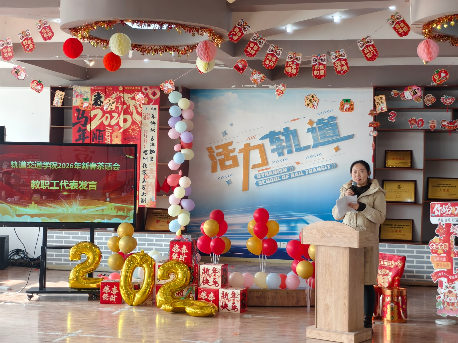 日月其迈,岁律更新。1月16日,轨道交通学院在温馨喜庆的氛围中,隆重举行2026年总结会暨新春茶话会。学院全体教职工欢聚一堂,共话奋斗历程,共享收获喜悦,共绘发展蓝图,喜迎新春佳节。